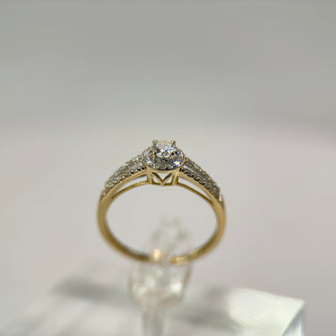 Haga una declaración con este exquisito anillo nupcial de diamantes con halo redondo elaborado en oro amarillo de 14 quilates. Eleva tu look con esta impresionante pieza que irradia elegancia y sofisticación.