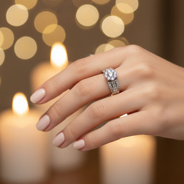- Diamante redondo central rodeado por un halo de diamantes más pequeños para mayor brillo.