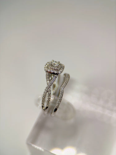 Disfrute de la exquisita belleza de nuestro anillo nupcial DR1110, elaborado en impresionante oro blanco de 14 quilates para agregar un toque de lujo a su momento especial. La pieza central presenta un deslumbrante diamante de talla cojín rodeado por un halo de diamantes más pequeños, creando un brillo fascinante que captura la esencia del amor eterno.