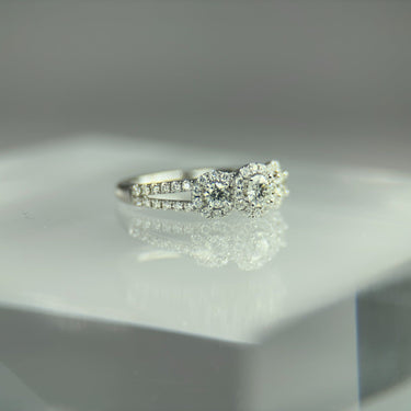 Experience timeless elegance with our DR1025 14K White Gold Bridal Ring featuring a stunning round-cut diamond design symbolizing the past, present, and future of your love story.